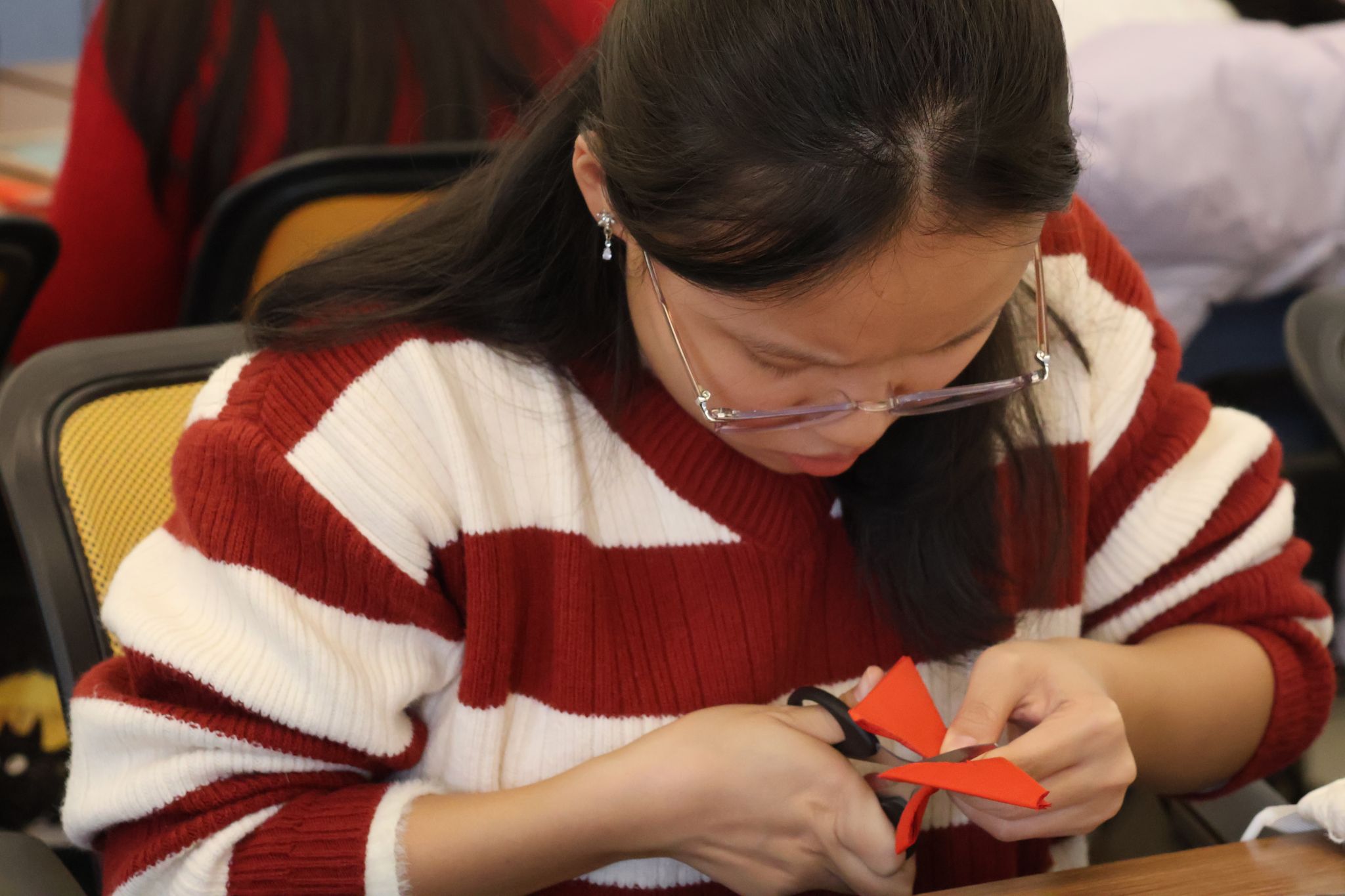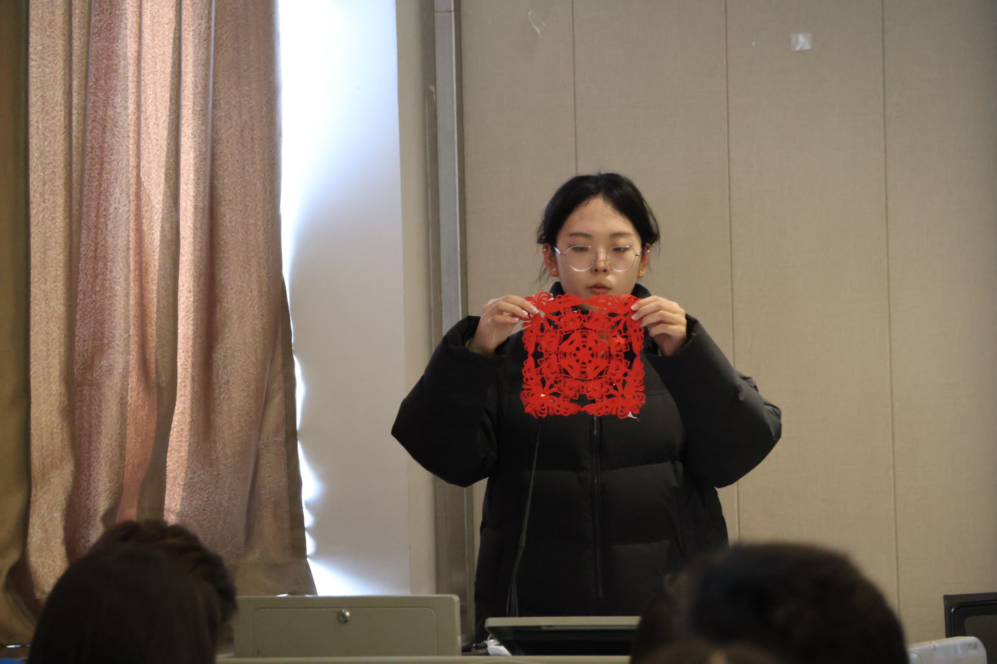 实践环节中,学员们跟随刘嘉嘉采用“折叠法”动手体验。刘嘉嘉示范并强调:“关键在于‘万剪不断’,图案彼此相连才能构成完整作品” 。她穿行于课堂之间进行指导,耐心解答同学们的疑问,现场学习氛围专注而融洽。