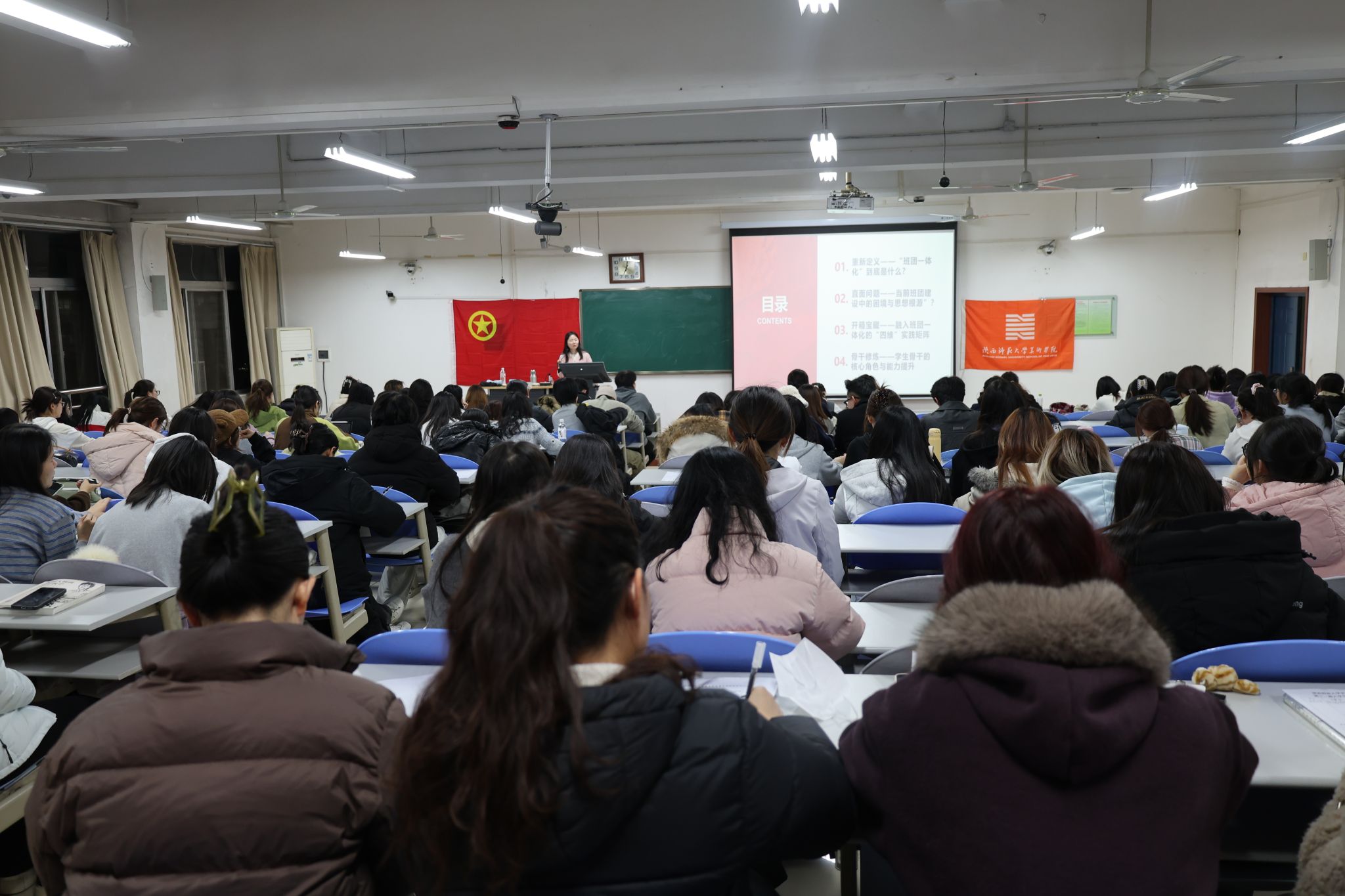 讲座中,席梓菁老师从班团一体化的内涵与历史渊源出发,系统阐释了团支部的政治核心属性与育人使命,深入解读红色文化资源的内涵及其在班团建设中的实践价值。围绕“四维赋能”实践路径,她对员工骨干提出明确要求,鼓励大家以“战略家”的视野谋划工作,以“组织家”的智慧凝聚力量,以“实干家”的担当推动落实,不断提升政治引领与组织协调能力。席老师还倡议同学们积极调研同学需求,结合专业特色设计红色文化融入班团活动的具体方案,争做红色基因的传承者与班团建设的实践者。
