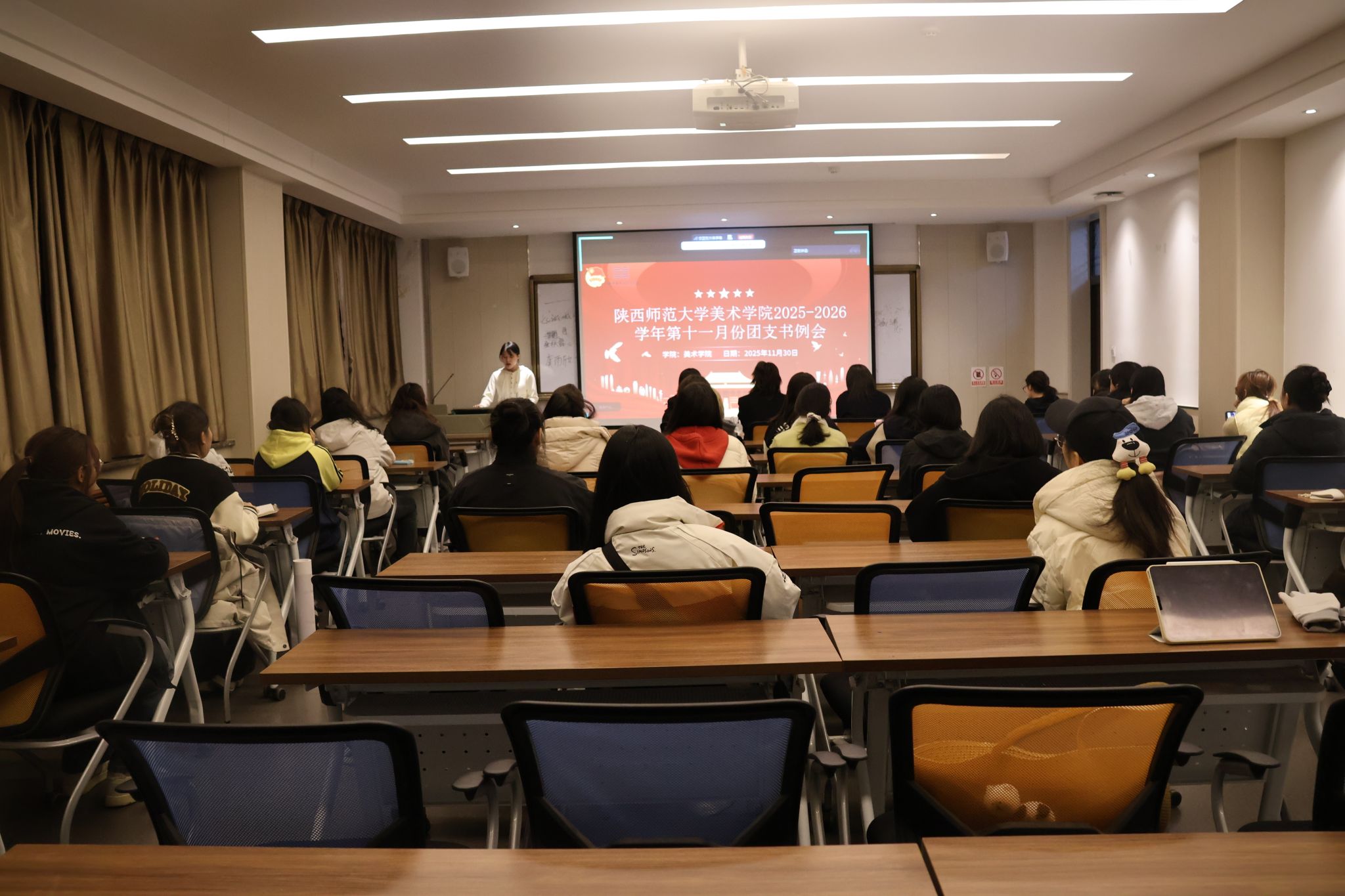 胡雨兰首先对十一月份工作进行了系统总结,围绕思想引领、组织建设、实践活动等方面,重点聚焦于主题团日活动的规范化开展,就近期主题团日活动的具体安排和评价标准进行了详细说明。随后,孙雅媛就即将在全院团员青年中深入开展的“学习团规团纪 增强团员意识 争做‘五个模范’教育活动”进行了安排部署。