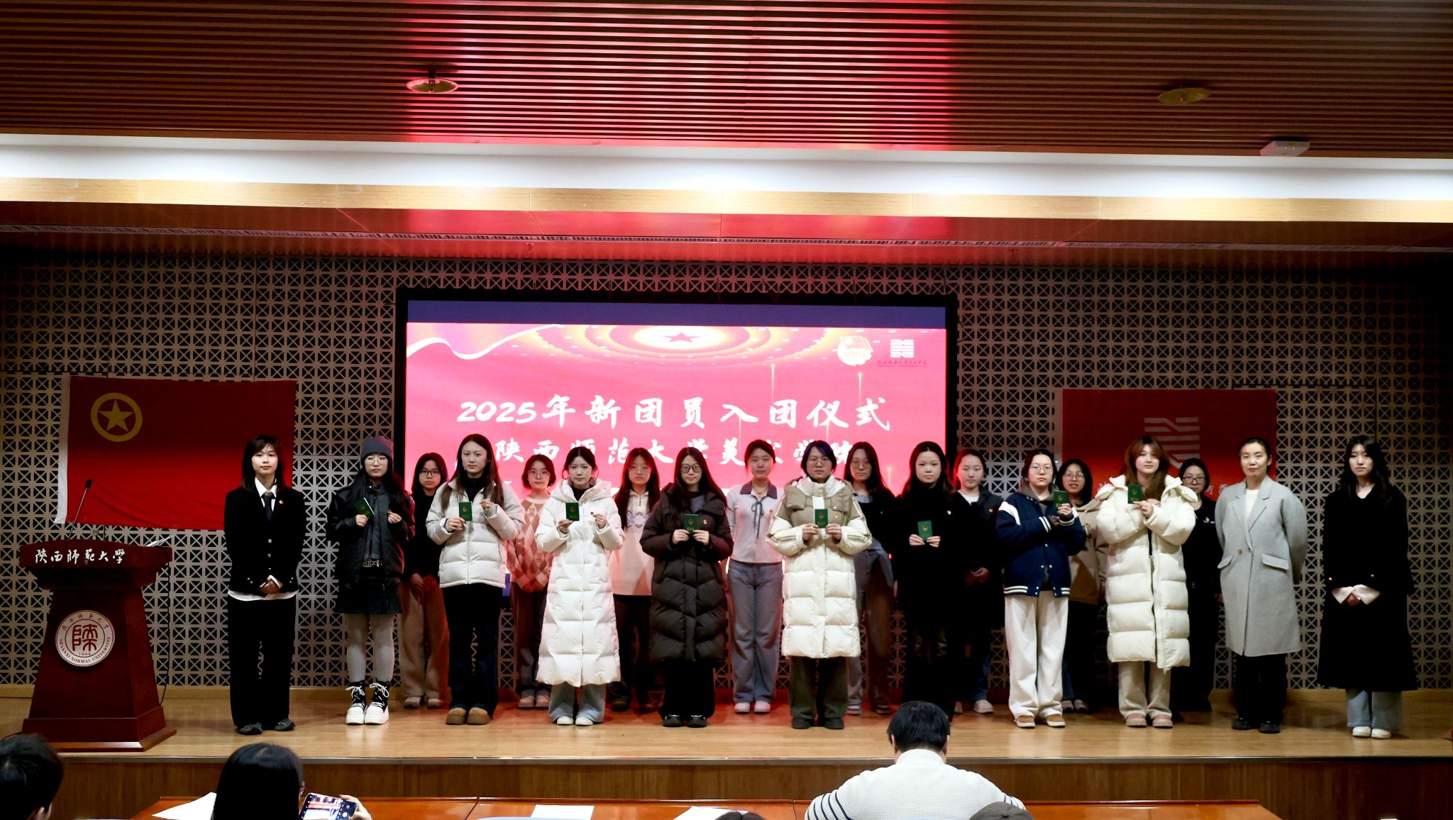 仪式在雄壮的《中华人民共和国国歌》声中拉开序幕。随后,主持人宣读了新发展团员名单,孙雅媛为新团员代表颁发团员证并佩戴团徽。全体新团员面向鲜红的团旗,举起右拳,在团委副书记马骏的带领下,用洪亮的声音庄严宣誓:“我志愿加入中国共产主义青年团……”铿锵有力的誓言回荡在会场,表达了新团员们坚定理想信念、矢志奋斗拼搏的决心。