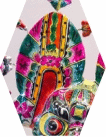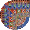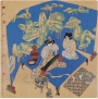 《弦响》画中两名女子在演奏乐器,前面有香炉,后面蓝色屏风中运用几何图形描绘出荷花的造型,造型平面夸张变形,色彩给人感觉强烈,有冲击力。