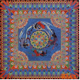 (6)欣赏《莲花飞天藻井》图,分析画作的色彩特点?为什么色彩对比强烈而又和谐统一?引导员工回答,装饰色彩的运用(3min)