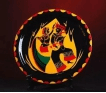彝族漆器色彩大量运用红、黄、黑,描画的是一男一女在火焰在跳舞的形象,夸张,漆器外围的装饰,造型单纯、平面化,富有意象。(彝族自称“诺苏”,其中“诺”即“黑”的意思,足见黑色在彝族中的重要性。对红色的崇尚则与彝族先民善战和喜猎有关。战争与狩猎的过程中,流血总是难免的,对红色的崇拜也就意味着对勇敢与进取精神的追求。黄色在彝族人民的审美中,则象征着美丽与光明。)