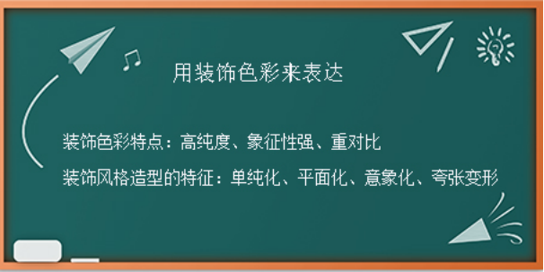 最后老师总结得出结论,装饰色彩的概念:装饰色彩不受自然形象中色彩的影响,强调夸张和对比,色彩鲜艳,造型平面化,质朴而充满想象力。(2min)